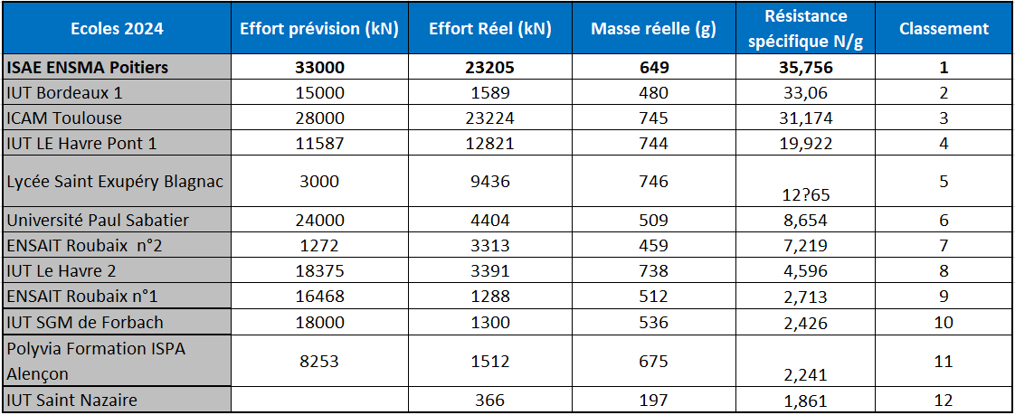 Pour la 4ième fois (2021, 2023, 2024 et 2022) l'école ISAE-ENSMA de Poitiers remporte le concours ponts 2025 du SAMPE France lors des journées techniques qui ont eu lieu le 20 et 21 novembre à Biarritz. Ce prix est basé sur la meilleure résistance spécifique obtenue en direct sur une machine d'essai. Encore bravo à cette école qui participe de façon régulière à ce concours.
